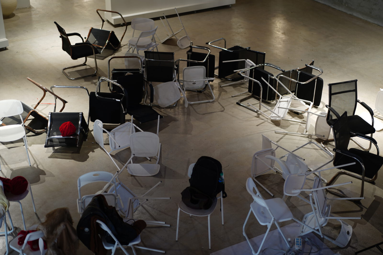 Im Dezember 2025 wurde eine Kopie der „Partiturskizze zu einer mechanischen Exzentrik“ (1925) von László Moholy-Nagy von Sichi Li (1pp1) in den Koffer gepackt und nach Jingdezhen, China geflogen. In Kooperation mit dem lokalen Kurator 于大于(Yu Da Yu) entstand ein zweitägiger Workshop mit Vortrag, Diskussion, Probe und Aufführung. Zehn chinesische Teilnehmende kamen zusammen, um die Partiturskizze zu betrachten, zu analysieren, zu diskutieren, auszuprobieren, direkt zu praktizieren und zu versuchen, einen neuen performativen Code auszugraben. Die Kopie der Partiturskizze wurde als offenes System verstanden. Ein Tag später brachen vier Personen den Prozess ab. Eine neue Person stieg spontan ein. Was zunächst wie Instabilität erschien, wurde Teil der Struktur. Nach ungefähr 30 Stunden entstand eine Jingdezhen Edition der Partiturskizze. Sie wurde in einem ehemaligen Getreidespeicher – heute eine Porzellankunst-Galerie – aufgeführt und gefeiert. Das vollständig mit Aluminiumfolie verhüllte Bühnenbild stammte von einer anderen Aufführung “The Peony Pavilion”. Es wurde einen Tag vor Abbau doch verlängert stehen zu bleiben und konnte so upgecycelt und weiterverwendet werden. Der rote Faden war ebenfalls ein Überbleibsel von “The Peony Pavilion” und wurde neu eingesetzt. Die Bühne wurde am Ende der Aufführung direkt von den Performer*innen abgebaut und aufgeräumt: Die Stühle wurden dem Publikum direkt unter dem Körper weggezogen und die Zuschauer:innen wurden aus dem Raum gedrängt. Während des Workshops wurde wiederholt auf die BauBü (Bauhaus Bühne) -Theorie von Moholy-Nagy verwiesen: Die Bühne ist kein Illusionsraum, sondern ein experimentelles Feld. Fünf Elemente strukturieren die Aufführung: Farbe, Ton, Bewegung, Geruch, Form. Keines dieser Elemente dominiert die anderen. Sie existieren nebeneinander, beeinflussen sich gegenseitig und bilden eine nicht-hierarchische Landschaft. Diese Bühne ist keine Erzählmaschine. Sie ist eine Struktur ohne Zentrum. Gerade in dieser Gleichwertigkeit liegt ihr demokratisches Moment. Die Aufführung im Workshop war keine Rekonstruktion des historischen Werks. Sie war eine lokale Edition. In Jingdezhen, einer Stadt mit langer Tradition kollektiver Produktion, verschob sich der Fokus vom individuellen Künstler zur Gruppe. Die Partikurskizze wurde zum Werkzeug. Die Gruppe wurde zum Medium. Die zweitägige Veranstaltung hieß „Volksbühne, Volksrepublik!“. Dieser Titel ist weder ironisch noch rein politisch gemeint. Er beschreibt einen Versuch: Kann eine Bühne als Modell einer Gesellschaft funktionieren? Kann eine ästhetische Struktur demokratische Prinzipien erfahrbar machen? Wenn Farbe, Ton, Bewegung, Geruch und Form gleichwertig sind – dann entsteht vielleicht kein utopisches Bild, aber eine temporäre Praxis. Eine temporäre Praxis der Demokratie.