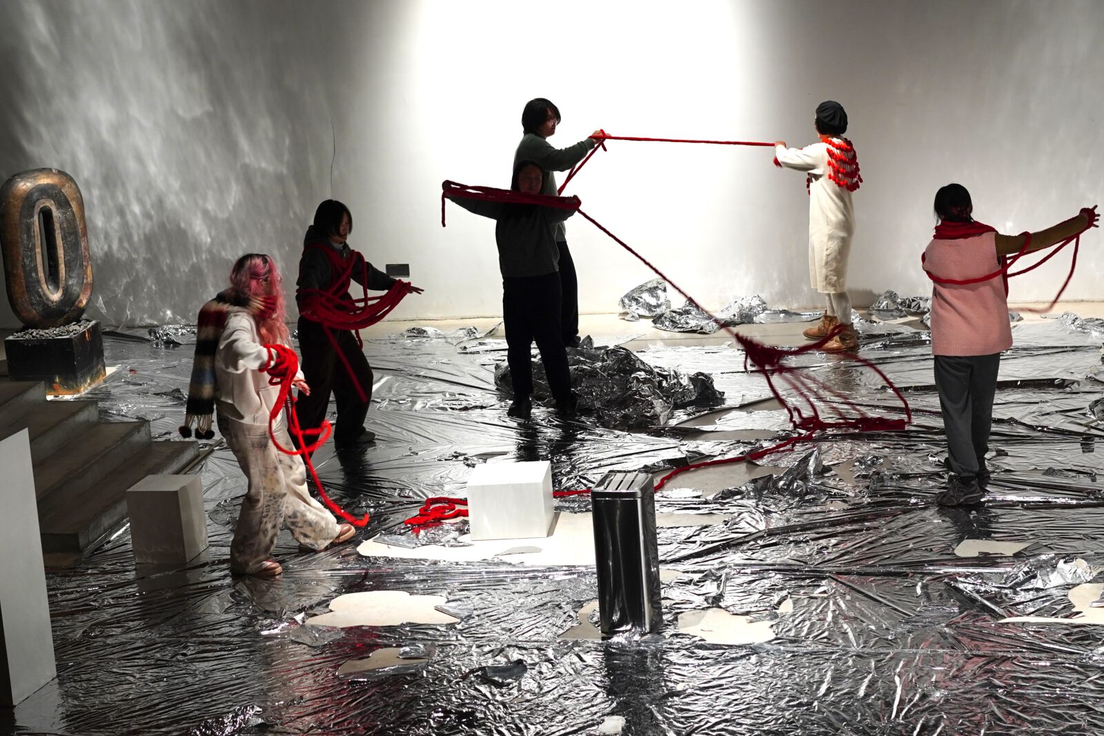 2025年12月,László Moholy-Nagy1925年的《机械偏心的乐谱草图》的一份复印件,被1pp1成员Sichi Li装进行李箱,随身带到了中国景德镇。在当地策展人于大于的合作下,一个为期两天、包含讲座、讨论、排练与演出的工作坊得以展开。十位中国当地的参与者聚集在一起,对这份乐谱草图进行阅读、分析、讨论与尝试,并直接投入实践,试图从中挖掘出一种新的表演性编码。乐谱草图的被理解为一个开放的系统。一天之后,四位参与者中途退出,一位新成员临时加入。最初看似的不稳定发生,成为了结构的一部分。大约30小时后,一个景德镇版本的“乐谱草图”得以形成。它在一座曾经的谷仓里——如今的陶瓷艺术画廊内——被上演并庆祝。被铝箔材料完全包裹的舞台装置来自前一天的另一场演出《牡丹亭》。在撤景过程中,它被要求保留下来并继续使用。演出中的红线同样来自《牡丹亭》的道具,它被拆除,重新置入新的语境。演出结束时,舞台由八位表演者直接拆除,清理。观众席的椅子被抽走,观众随后被引导离场。在工作坊期间,Moholy-Nagy的包豪斯舞台理论被多次提及:舞台并非幻觉的空间,而是一个实验性的场域。演出由五个元素构成:色,声,动,味,形。没有任何一个元素凌驾于其他之上。它们并置存在,彼此影响,形成了一种非等级化的结构。舞台不是一台叙事机器,而是一种没有中心的结构。正是在这种平等关系之中,呈现出其民主性的维度。这场演出并非对历史作品的重建,而是共振在地性的版本。在景德镇——一座拥有悠久集体生产传统的城市——焦点从个体艺术家转向群体。乐谱草图成为工具,群体成为媒介。这场为期两天的活动被命名为“人民剧场,人民共和!”这个标题既非讽刺,也非单纯的政治姿态。它指向一种尝试:舞台是否可以作为社会模型而运作?美学结构是否能够让民主原则变得可感?当色、声、动、味、形彼此等值时,所生成的或许不是乌托邦的图景,而是一种暂时性的实践——一种短暂的民主实践。